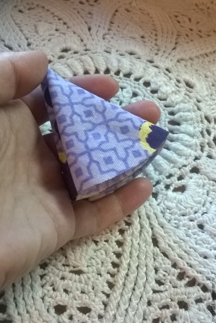 Полосу ткани для ручек складываем вдоль к центру, потом так же вдоль пополам и завязываем посередине аккуратный узел.
