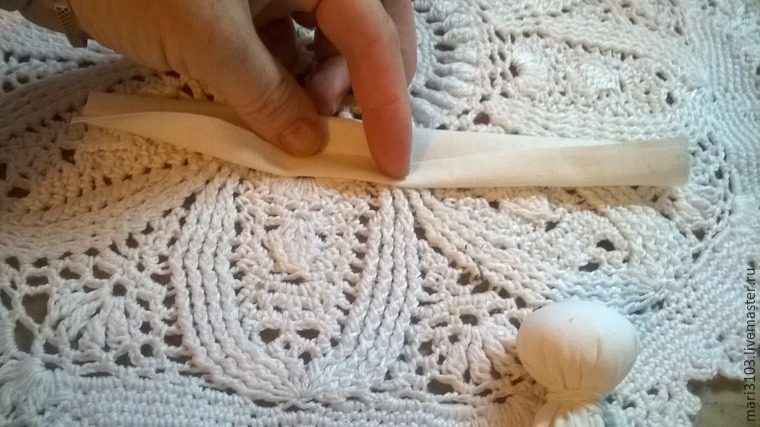 Помещаем узелок на голову куколки, приматываем ручки к шее.
