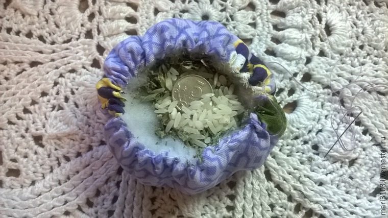 Наполнитель: синтепон, душистые травы (у меня смесь мяты, полыни и малинового листа), крупа (я взяла рис, он, как и гречка, символизирует плодородие и достаток), монетка с цифрой 5.