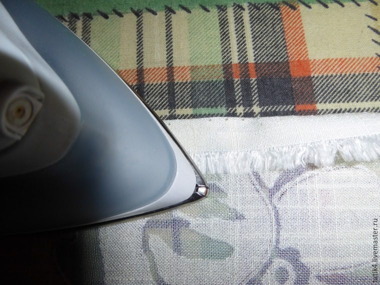 Стоит обратить внимание на боковые швы шторки, а точнее, на их отсутствие. Я беру паутинку, включаю утюг и припаиваю боковушки. Это дополнительно даст жёсткость по бокам, и шторка будет висеть ровнее.