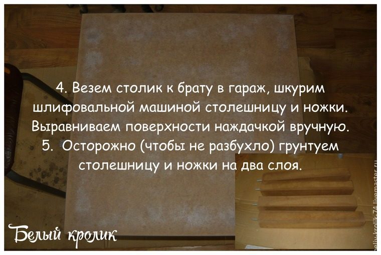 5. Стол прогрунтовали на два слоя. Нужно быть аккуратными в местах царапин и сколов — если там оставить много грунтовки, в этом месте стол разбухнет.