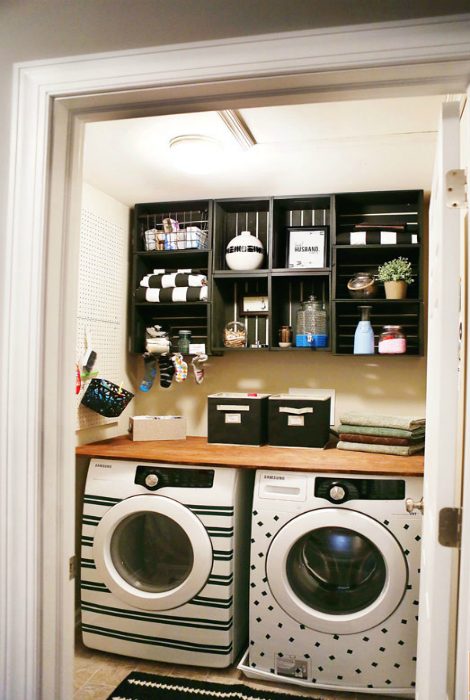 Стильная полка из нескольких деревянных ящиков, покрашенных в черный цвет и скрепленных между собой — оригинальна и бюджетная идея для оформления стены прачечной.