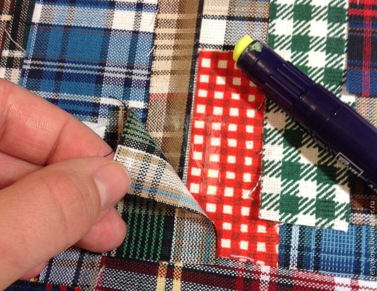 3. Далее специальным текстильным клеем или же обычным клеящим карандашом проклеиваем те части лоскутков, которые находились не на паутинке, а поверх других и, соответственно, не приклеились. Здесь нам важно не полностью приклеить всё, а так, чтобы края не мешались при стёжке.