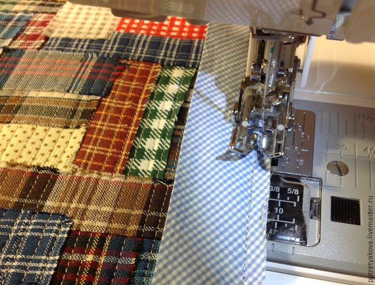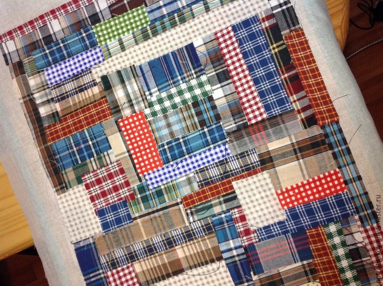 5. Стегаем нашу конструкцию как угодно, главное почаще, чтобы закрепить все лоскутки. Так как мои обрезки были в основном прямоугольной формы и выложила я их лентами, то для закрепления выбрала простые линии, перпендикулярные направлению выкладки.