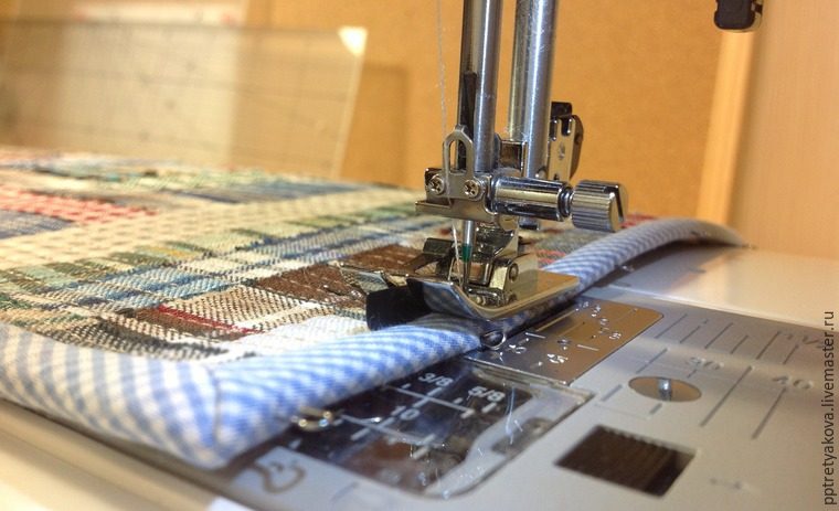7. Окантовываем привычным для вас способом. Обычно я с лица пришиваю косую бейку на машинке, а с изнанки — руками потайным швом. Однако в этом случае я сделала так: пришила бейку с лицевой стороны на машинке.