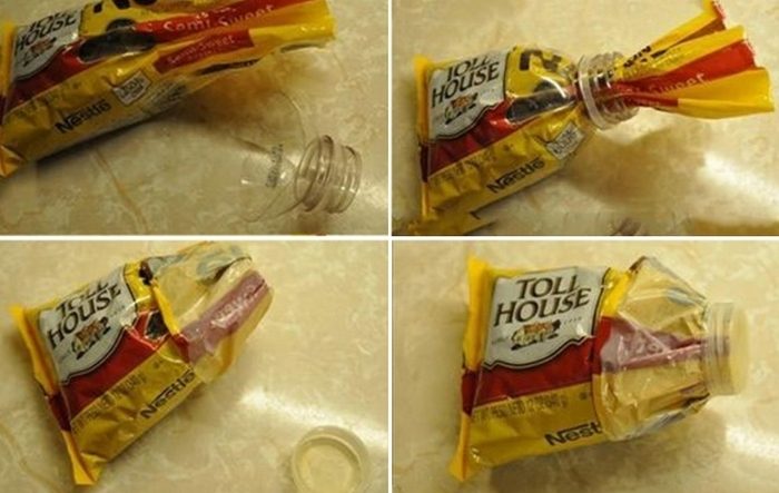 Обрезанную пластиковую бутылку можно использовать для удобного хранения хруп и макарон. Для этого нужно заправить в горлышко бутылки концы открытого пакета с бакалейным продуктом, а потом закрутить крышкой. Теперь можно не переживать, что крупа рассыплется.