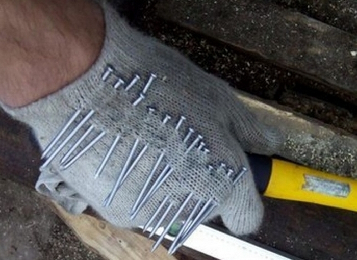 Те, кто хотя бы раз работал молотком, сталкивались с проблемой, когда гвозди рассыпаются, падают на пол и теряются. Решить это проблему поможет текстильная рабочая перчатка – её можно использовать как своеобразную «подушку» для гвоздей.