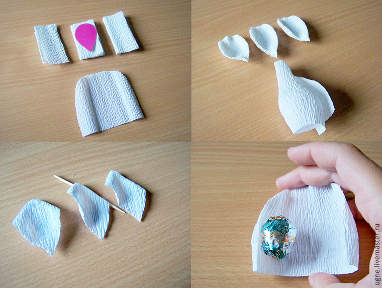 2. Вставим конфетку и обтянем ее бумагой. Плотно завяжем хвосты бутона.