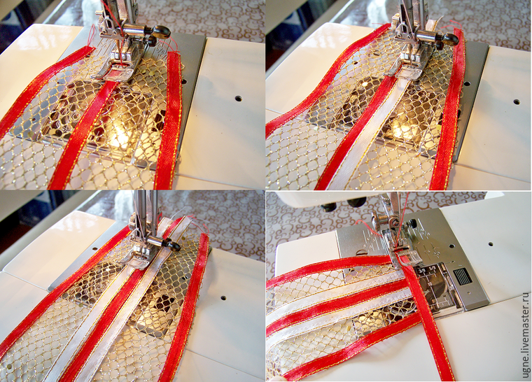 Дальше пришиваем центральную красную ленту. Очень просто отбить центр и регулировать симметрию.