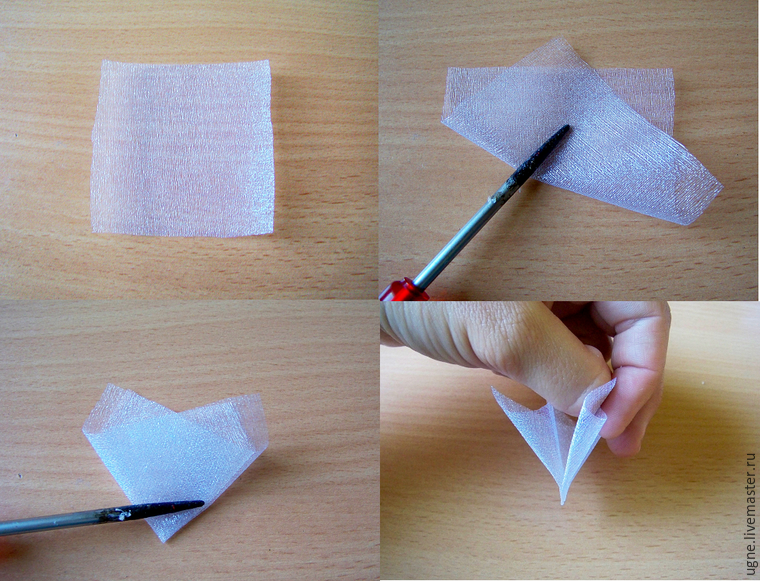Для заполнения пустого пространства люблю использовать фунтики.Такие треугольнички. Делаются быстро и дают объем. Конечно, и они еще очень красивы. Ведь чтобы их сделать, используется органза.