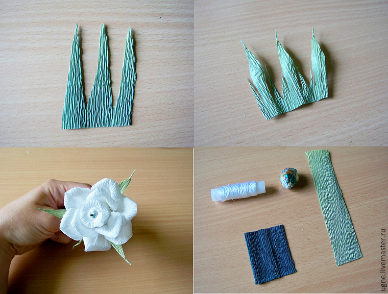 4. Приготовим детальки для бутончиков. Светло-зеленая бумага цвета хаки размер 15см*3 см. Темно-зеленая бумага 1 пролет на 7 см шириной. Конфета с подклеенными концами. Нитка.