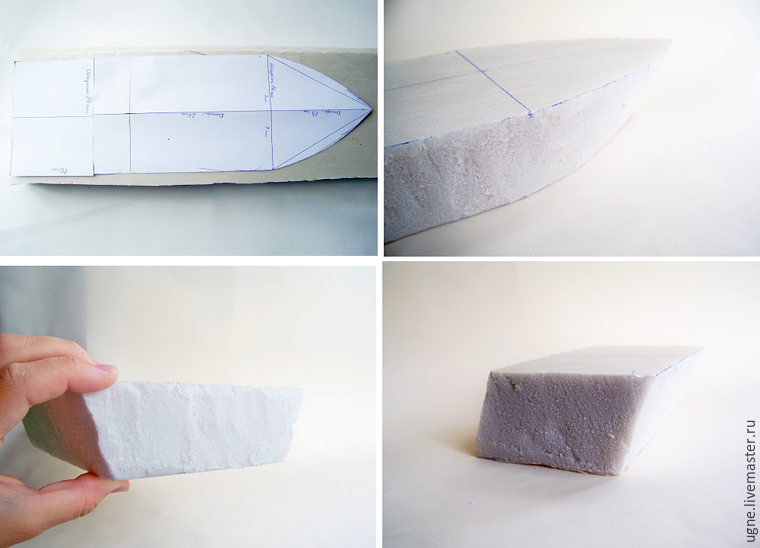2,3. Срезаем с верхнего края к нижнему наискосок 1.5 см (начинаем с конца корабля, двигаясь по бокам к «носу»). Нос стачиваем в самом конце. Стараемся не срезать основной изгиб корабля, а просто сузить днище.