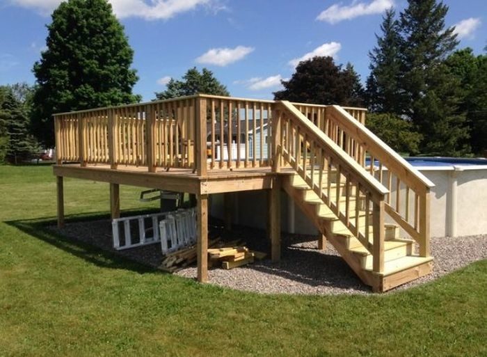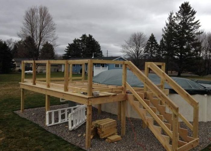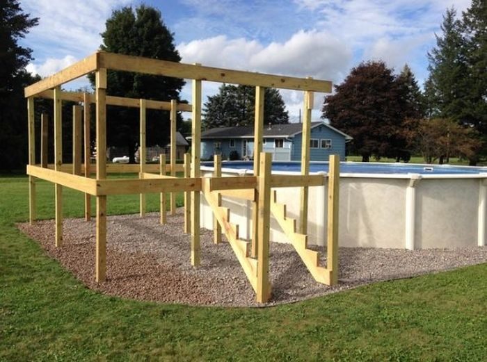 Каркасный бассейн может выглядеть совсем иначе, если рядом с ним появится небольшая деревянная терраса, как например в этом случае. Фотоотчет об изготовлении такой террасы ждет вас далее.