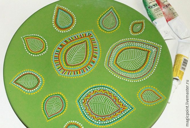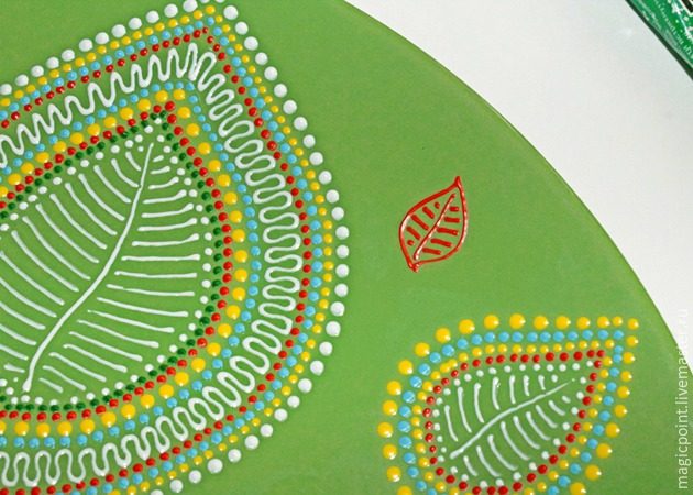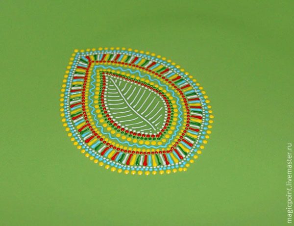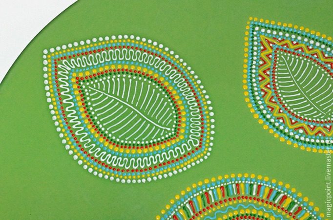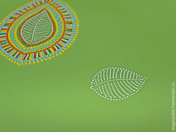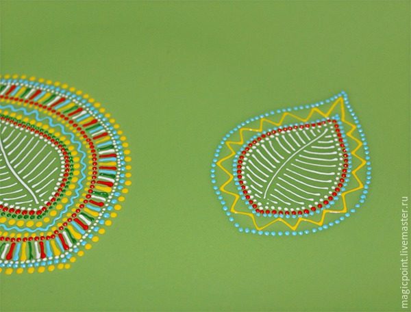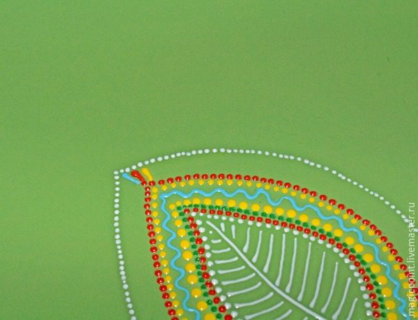 Затем каждый листик обводим точками разных цветов, чередуя их, а также чередуя мелкие точки с крупными. В итоге получается, что 3-4 ряда точек разного цвета обрамляют каждый мелкий листик.