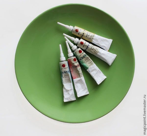 При работе с контурами всегда держите под рукой салфетку или бумажное полотенце, для того, чтобы вытирать носик контура, удаляя остатки акрила. Чем чище носик — тем точки аккуратнее и ровнее. Мелкие ошибки в росписи можно аккуратно удалить ватной палочкой.