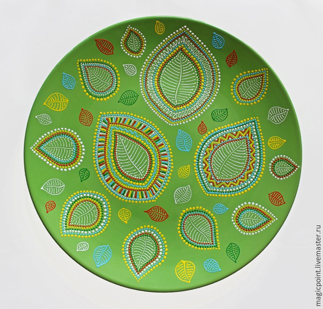 Рисунок тарелки будет состоять из фантазийных листочков разного размера и цвета, но основа у всех листочков будет белой.