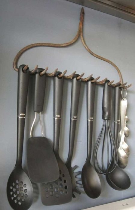Рейлинги и держатели для посуды никогда не будут лишними на кухне, но тратиться на такие удобства готов не каждый. В таком случае можно использовать вместо рейлинга старые грабли. Получится интересно и необычно!