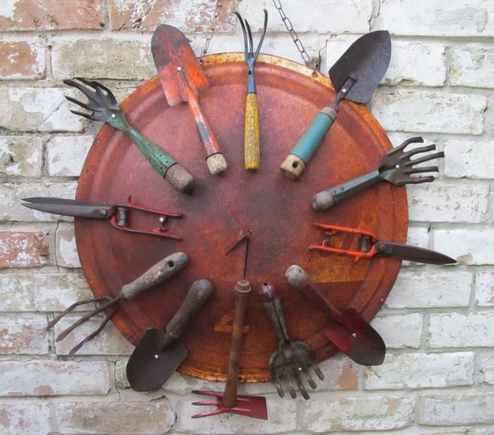 Из старых садовых инструментов можно сделать немало интересных и необычных вещей, например, часы, которые на даче не помешают.