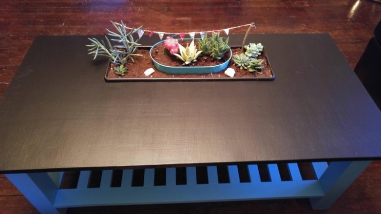 Парень же решил попробовать свои силы в изготовлении этого предмета интерьера со встроенным сочным садом. Теперь этот стол с его праздничными красками и живыми украшениями приносит красоту природы прямо в их гостиную.