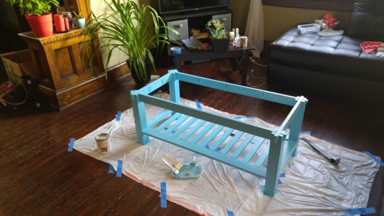 После высыхания грунтовки ловкий маляр нанёс слой бирюзовой краски на основание стола, придав ему современный и модный вид. А после посадки нескольких восхитительных суккулентов в ящик создание стола было завершено!