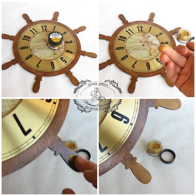 7.1. Приклеиваем металлический циферблат на штурвал с помощью клея Титан, совмещая экватор на карте с цифрами 9 и 3.