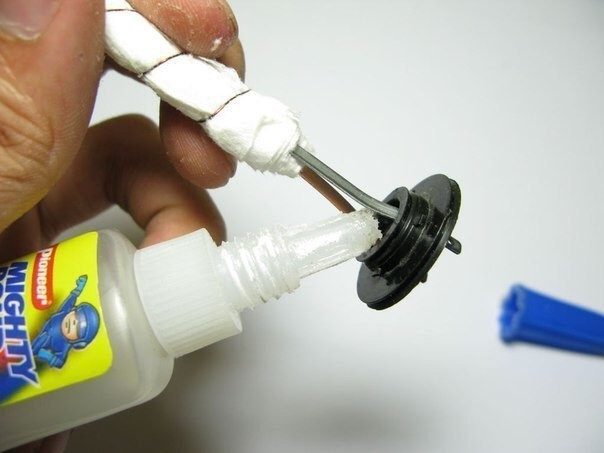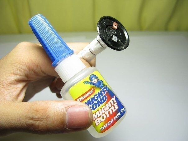 После этого подбираем подходящую по размеру пластиковую крышку (чтобы долго не искать подходящую по размерам, можно сделать самому из любого подходящего по размерам кусочка пластика), делаем в ней две прорези под электроды и герметизируем соединение с помощью суперклея.