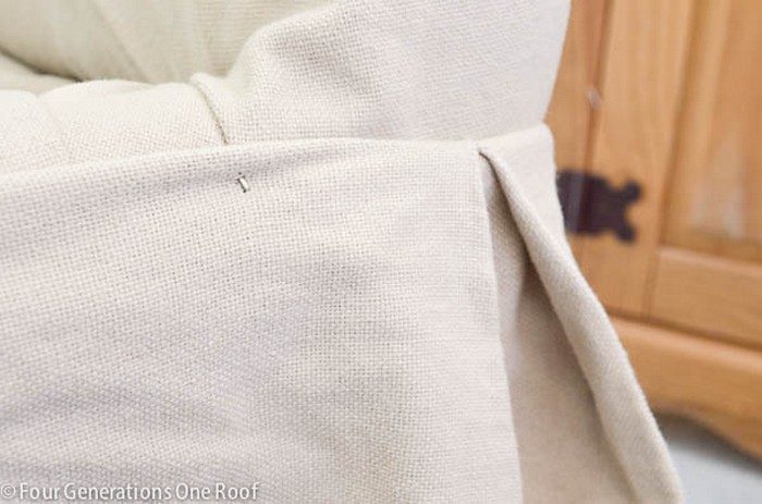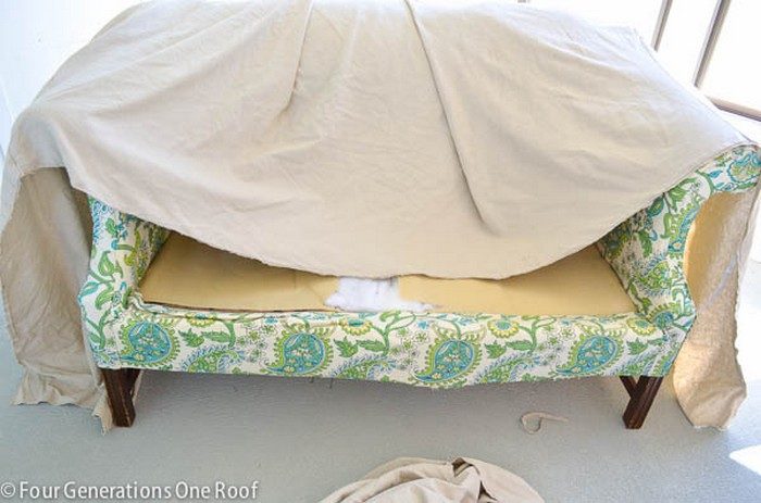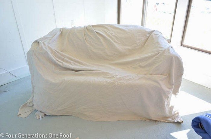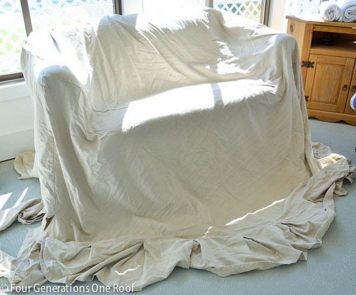 Накройте диван полностью, а остаток ткани, который окажется на полу, аккуратно, по периметру, отрежьте. Постарайтесь сделать это ровно – он вам еще пригодится.