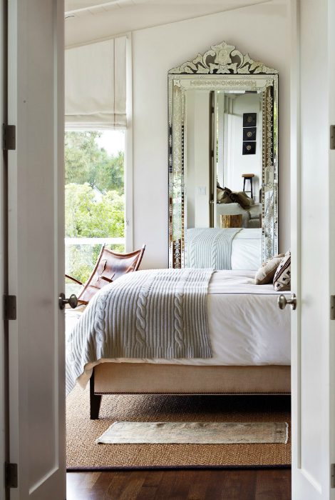 Всем известно, что грамотно расположенные зеркала позволяют увеличить или скорректировать границы помещения. Поэтому, большое зеркало, расположенное напротив дверного проема, позволит визуально расширить пространство маленькой спальни.
