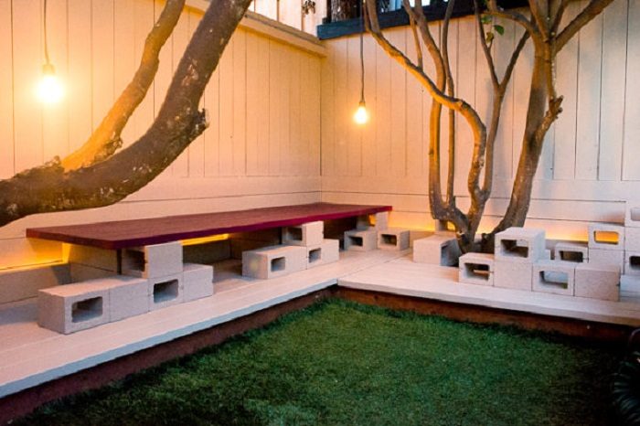 Лавочку можно создать просто при помощи досок и шлакоблоков — всё очень просто и удобно.