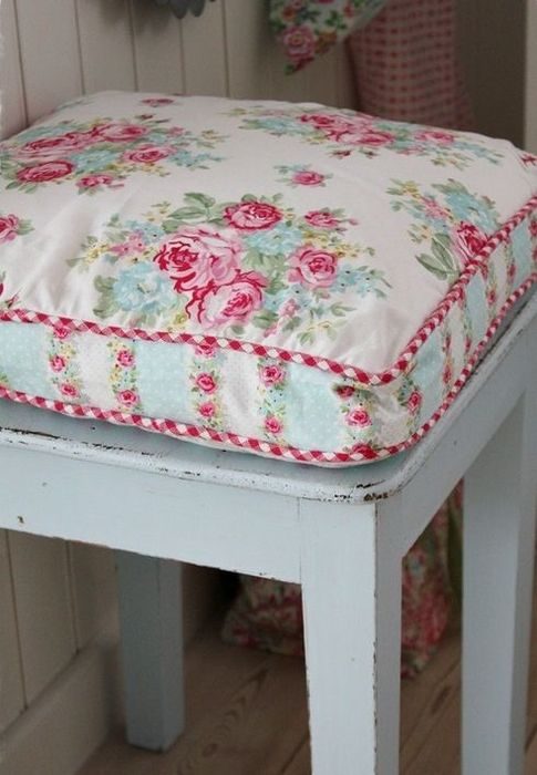 На табурете в разы удобнее сидеть, если на нём есть мягкая подушка. Изготовить такую совсем не сложно, особенно, если в запасах есть красивое постельное бельё с цветочными принтами. Такая подушка станет настоящим украшением интерьера!