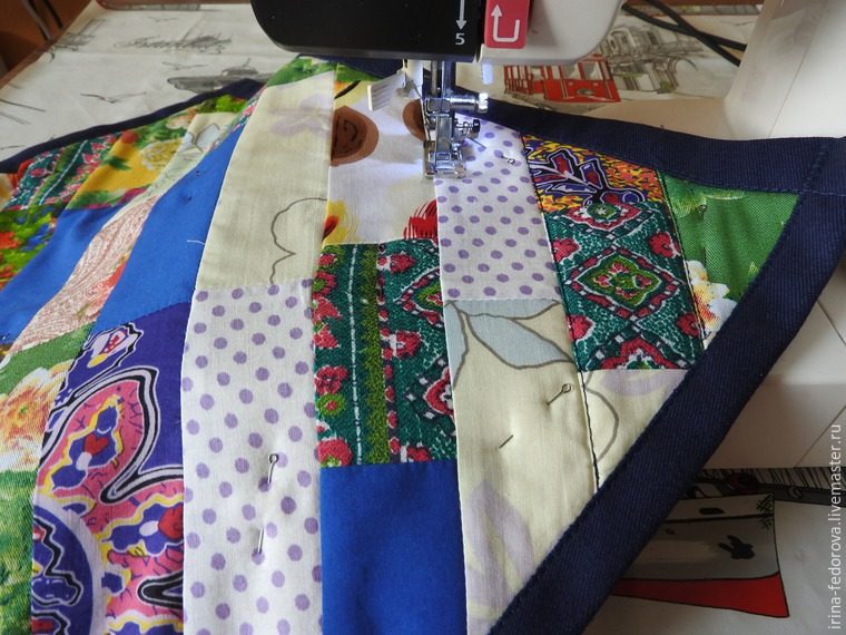 9. Делаем дальше так: складываем «сэндвич». На низ кладем темно-синюю ткань, в серединку ватин, а верх — лоскуточную. Все ровняем, еще раз проглаживаем, прикалываем булавками.