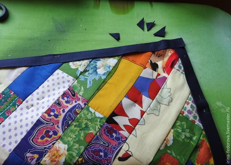11. Выпирающие уголки подрезаем так, чтобы они не торчали из-под подгибки, скалываем булавками для удобства при шитье и прошиваем по периметру.