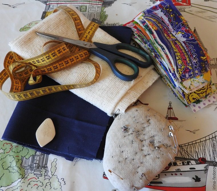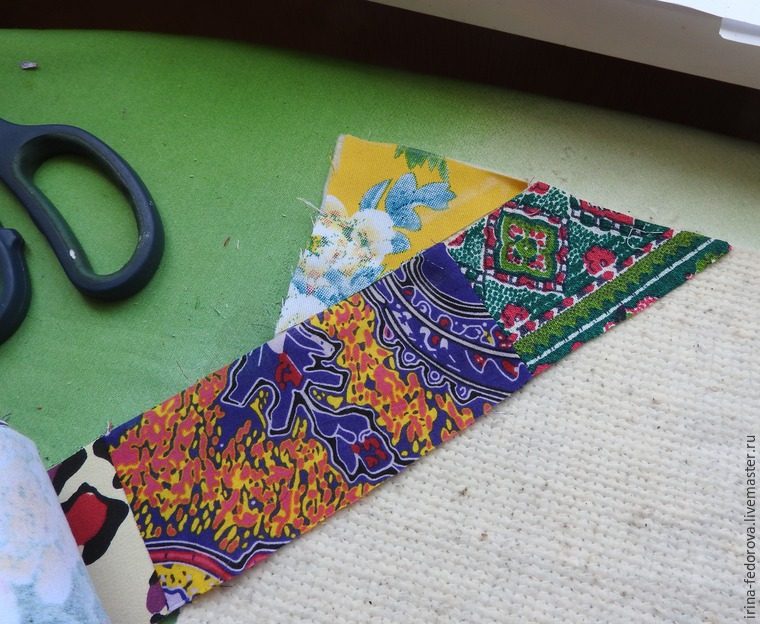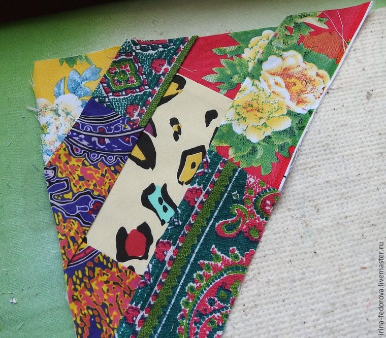 Я порылась у себя в закромах, нашла кусок ткани и множество обрезков. Из обрезков я наготовила полосок разной длины и одинаковых по высоте 6 см. Делала эту работу в первый раз. Додумывала все сама, как я считала для себя удобным.