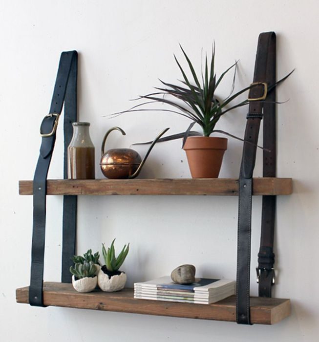 Чем хороши открытые полки, что их не сложно сделать собственными руками. Да, потребуется немного терпения, фантазии и времени, но результат стоит того. А из чего сооружать такую мебель? Для этого можно использовать старые кожаные ремни и несколько деревянных досок. Их этого набора получатся очень оригинальные и необычные полки.