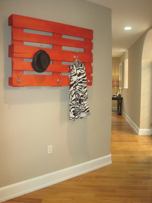 Из паллеты, покрашенной в яркий цвет, с прикрученными к ней крючками, получится чудесная вешалка для верхней одежды и сумок.