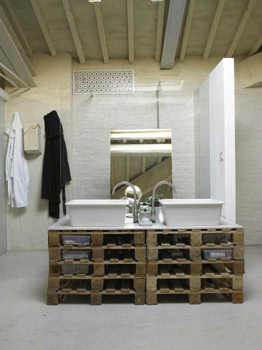 Подарите паллетам новую жизнь в виде оригинальной тумбы под раковину. Такое бюджетное решение станет эффектным и функциональным украшением скучной ванной комнаты.