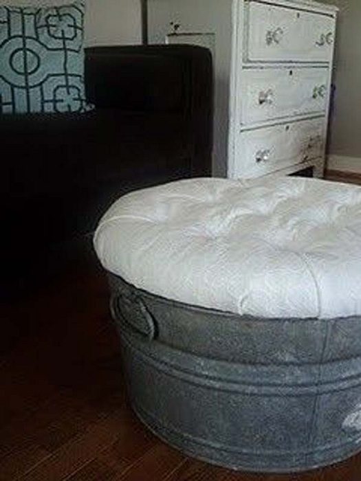 Прекрасный мягкий табурет, который создали из старого оцинкованного ведра станет просто отличным вариантом для декорирования любой комнаты.