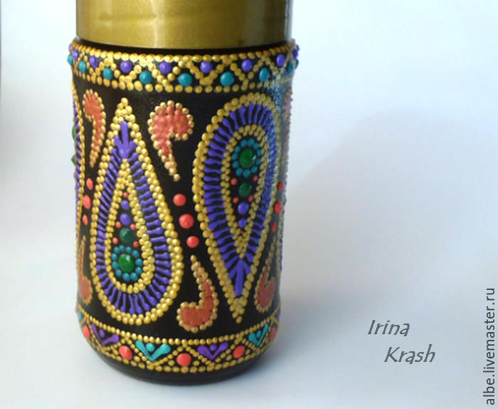 Кто любит с блеском, можете глиттером поставить по 3-5 точек на завитушках. После высыхания покрываем баночку защитным лаком (по желанию). Вот что получилось в результате: