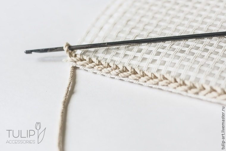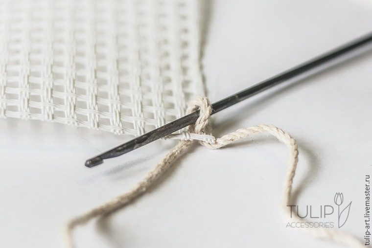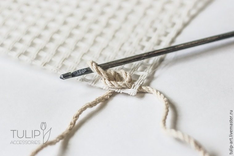 Начинаем вязание. Протаскиваем в угловое отверстие канвы петельку из шнура.