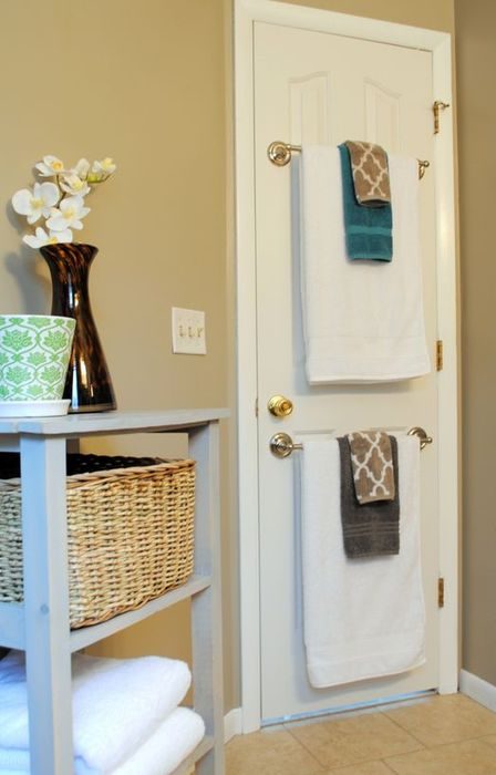 Не в каждой ванной есть возможность установить на стену полотенцесушители, поэтому нужно искать другие решения. Одним из таковых способно стать размещение полотенец на двери. Это здорово экономит пространство и позволяет разгрузить стены.