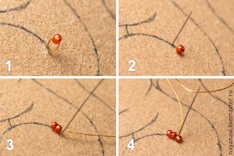 3. Наберите одну бисеринку, отступите от места прошлого прокола расстояние в одну бисеринку и пройдите сквозь кожу и фетр