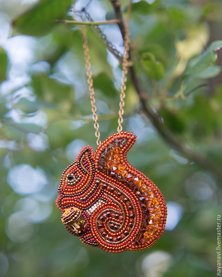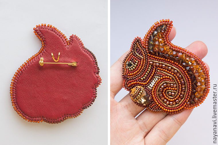 Для ее создания потребуется весьма небольшая бисерная палитра и россыпь кристаллов Swarovski различных осенних цветов. Главная особенность этой белочки — вышивка рядами бисера с чередованием его размеров и фактур, благодаря чему и удается достичь четких контуров и узнаваемой формы даже в такой небольшой работе.
