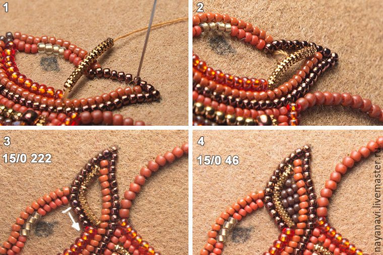 Верхняя лапка вышивается рыжим «огоньком», мелким темно-коричневым бисером и светлой бронзой: