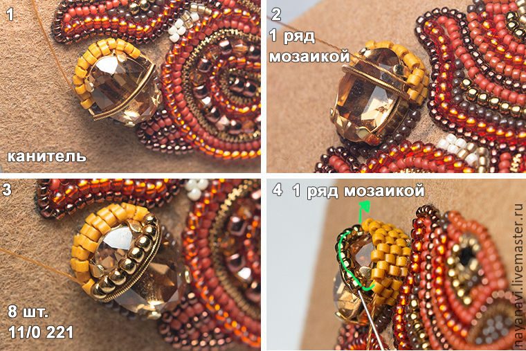 Отрезаем небольшой кусочек канители и делаем стяжку поверху кристалла. Плетем еще один ряд мозаикой горчичным бисером. В конце ряда набираем еще одну стяжку — 8 шт. 11/0 221. Плетем еще один ряд горчичным бисером и проходим еще один раз через последнюю бисерную стяжку: