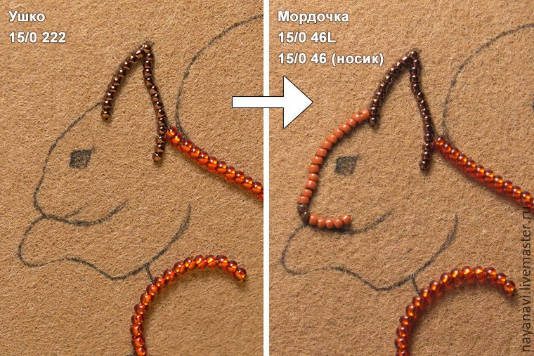 Таким образом вышиваем контур бедра и спинки нашей белочки, используем чешский рыжий бисер «огонек».
