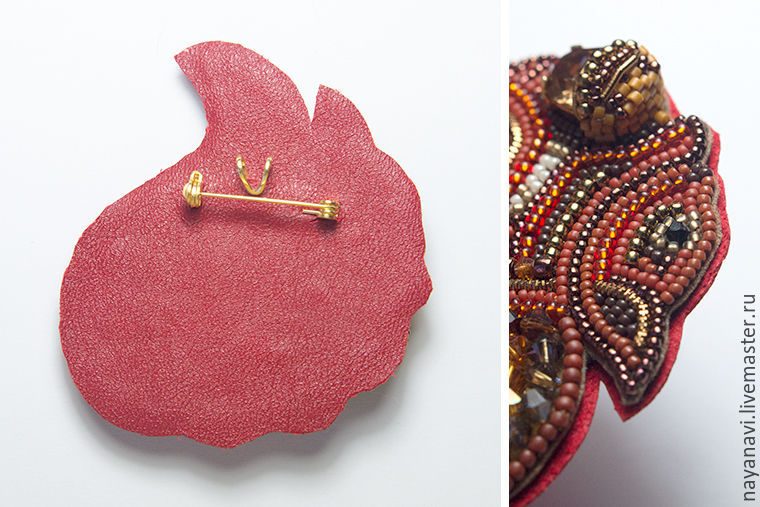 Для выполнения этой броши желательно знать следующие техники: шитье бисером способом «назад иголку», мозаичное плетение (peyote), обшивка края русским способом.