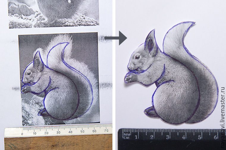 Поскольку наша белочка — не абстрактное существо, а очень даже реальное, имеет смысл ознакомиться с ее образом подробнее. В этом нам поможет любой поисковик с картинками. Мне понравился классический ракурс белки в профиль, и я подобрала несколько красивых фотографий и распечатала их в небольшом размере на листе А4. Обвожу одну из особенно полюбившихся белочек по контуру и вырезаю.