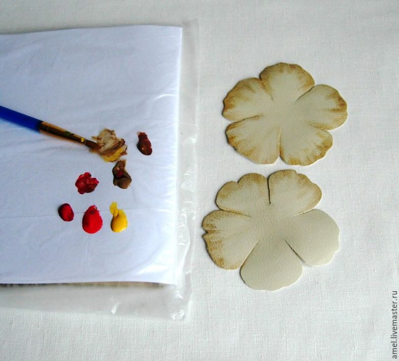 Рекомендую сделать одну лишнюю вырезку цветка и сначала пробовать на ней, чтобы понять, какой цвет получается в итоге. Акриловые краски при высыхании темнеют и вы можете не получить желаемый цвет