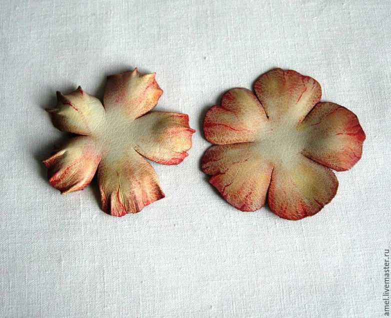 Рисую бумажный шаблон цветка и листьев. Диаметр цветка 9 см. Листья разных размеров, руководствуюсь рисунком. (Для шаблона я их скопировала с рисунка и вырезала.) Делаю раскладку и обвожу шаблоны. Цветы на молочной эко-коже. Листья- эко-кожа цвета кофе с молоком. Фото сделано так, чтобы было видно изнанку эко-кожи. Вырезаю.