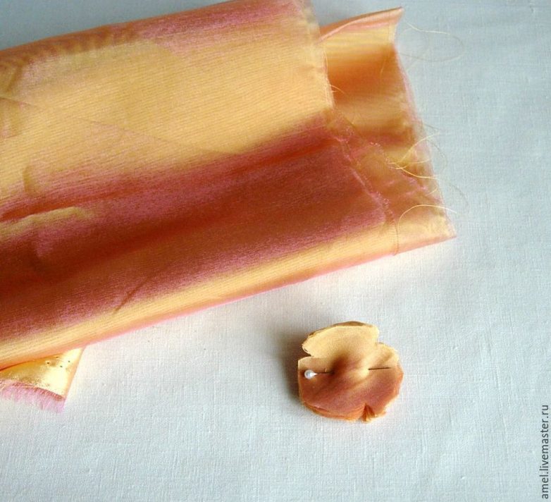 И… тут я опять не удержалась! Очень люблю работать с тканью :) Делаю серединку для цветка. Беру небольшой отрезок органзы-хамелеона в потрясающих осенних переливах (можно взять органзу или вуаль самые простые в подходящем цвете), вырезаю круги (в моем случае диаметром 3-5 см), обжигаю края над свечкой, причем я не делаю их очень уж ровные, в природе тоже не бывает идеально одинаковых лепестков, тычинок, листочков :)